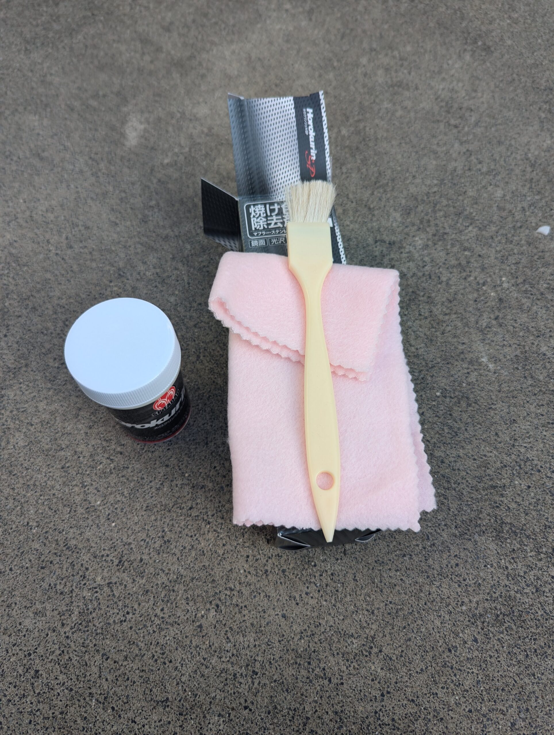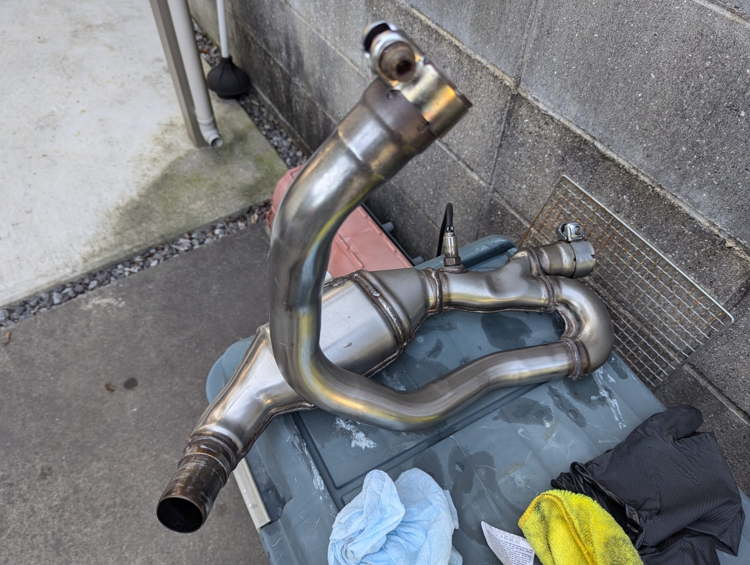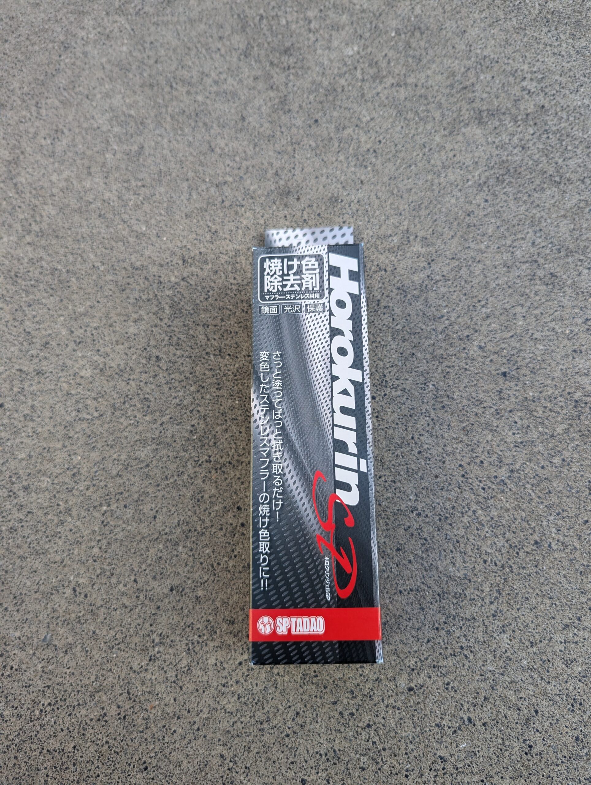 まぁどんなバイクでも付きまとう問題なのでしょうけど、特に塗装されていないステンレス製のエキゾーストはきれいに焼けてくれればまだよいんですが、黒くなってきてなんだかなぁといった状態になるので幸い今キャタライザー外しているのでちょっと焼け取り剤を使ってみることに