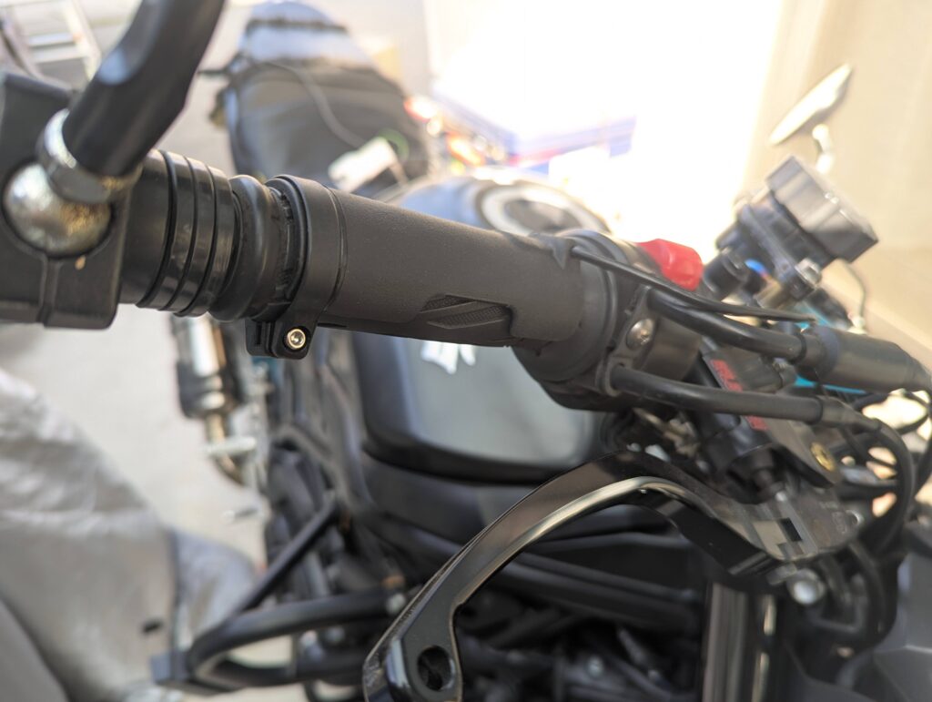 取り付けはいたって簡単、グリップの上にパチンとはめ込んで回り止めの輪っかで固定するか結束バンドで固定するだけです。スロットル側にはスロットルアシスト形状の固定具も有ります。