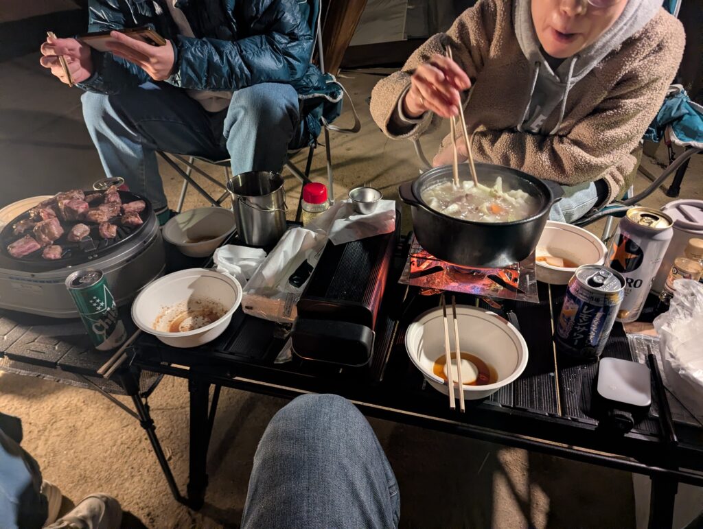 食事は今回は焼肉と鍋ですね、2月にしては異例の温かさでしたが、それでも日が落ちれば寒くはなるので暖かい食べ物が沁みます。